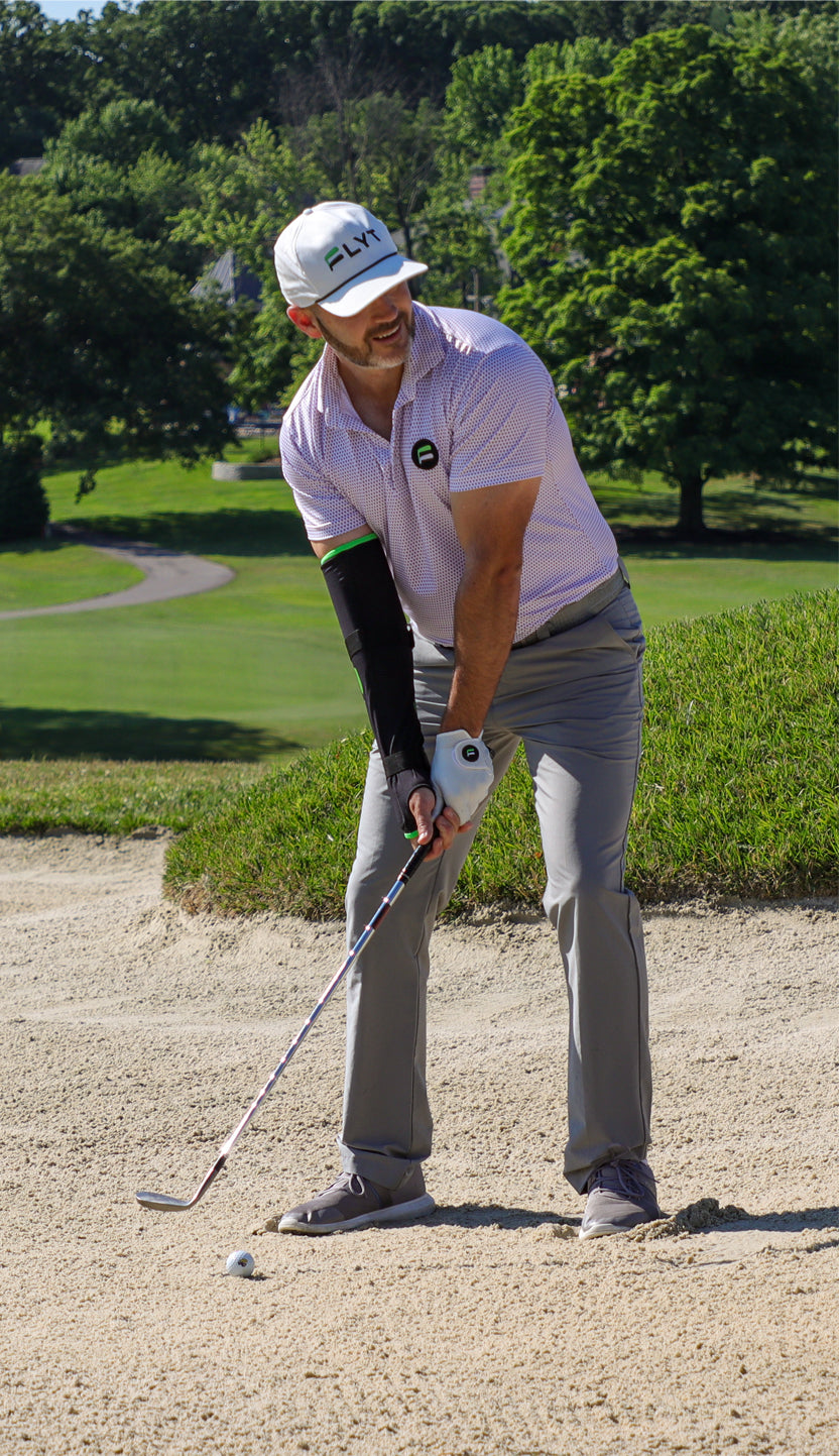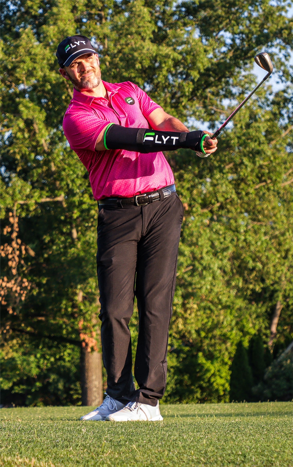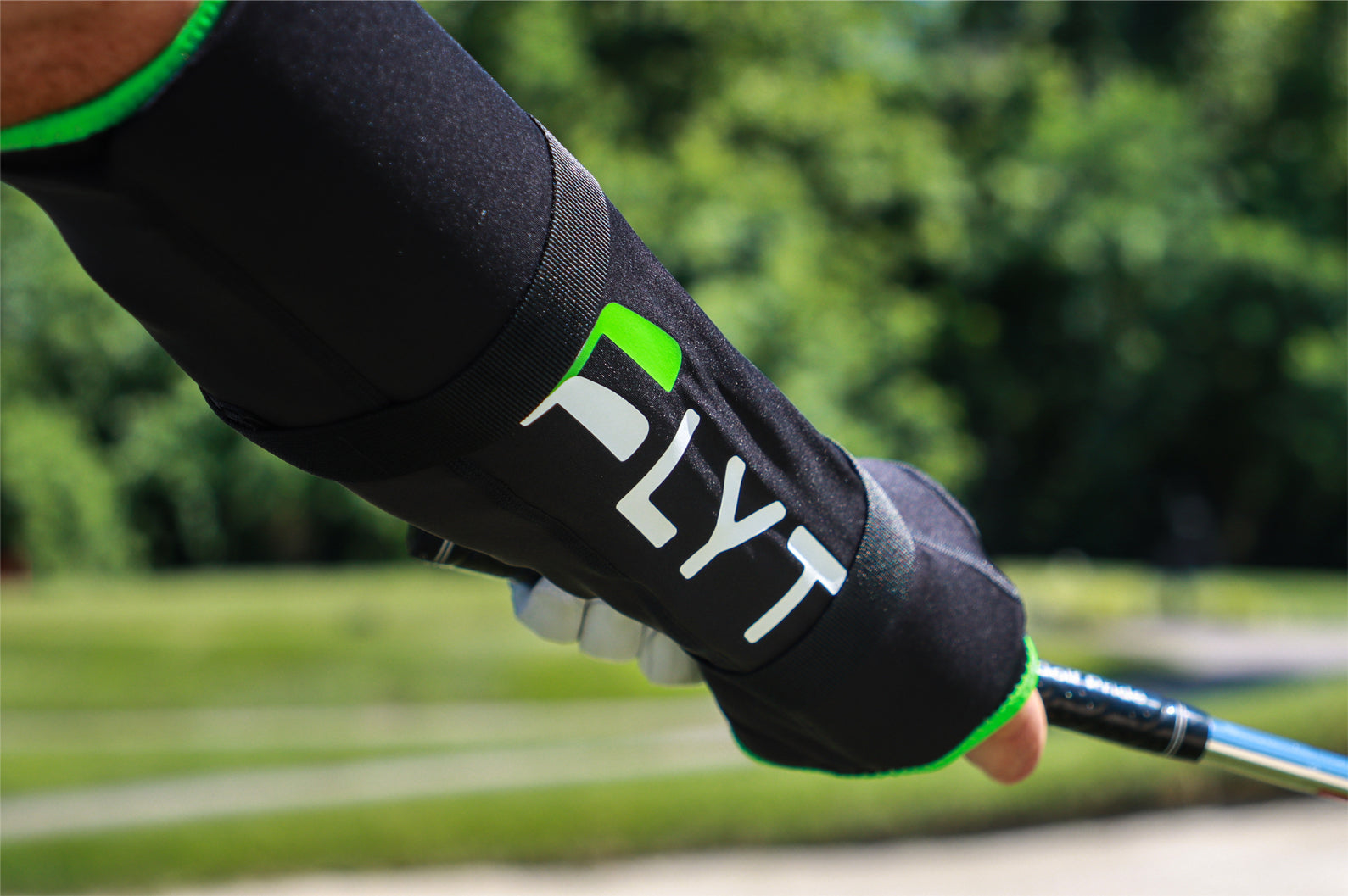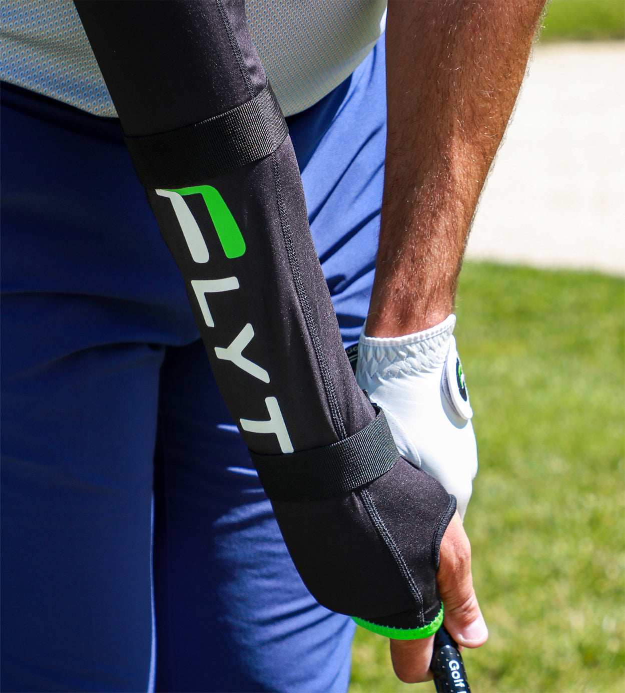 The FLYT Sleeve is designed for all aspects of the golf swing. For full swings it is best utilized on the front/lead arm (left arm for a right-handed golfer), keeping the arm straight in the back swing and reducing over rotation of the club head through the impact zone. When chipping and pitching it is best utilized on the back/trail arm (right arm for a right-handed golfer) promoting the straight arm chipping and pitching technique to minimize the influence of the hands and arms, increasing swing width and using the bounce correctly for a shallow swing every time. During the putting stroke our FLYT Sleeve can be worn on either arm to reduce movement in the right or left hand throughout the putting stroke to achieve the desired result and reduce movement.