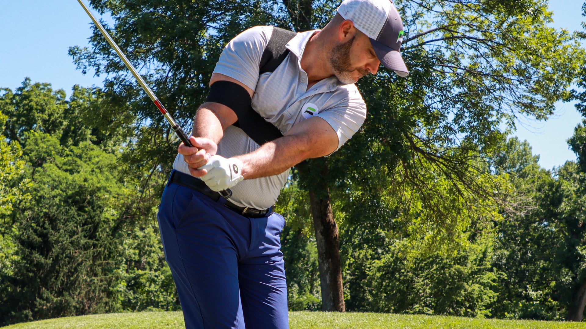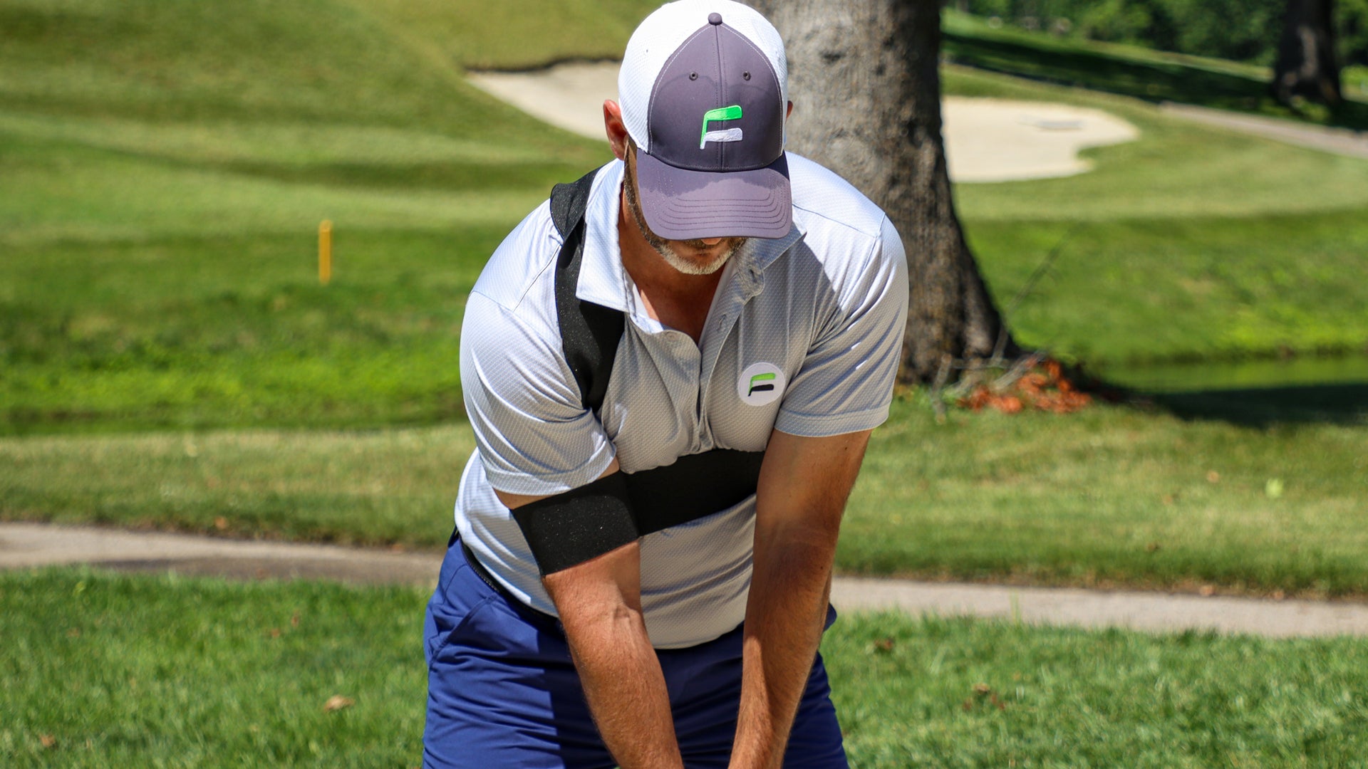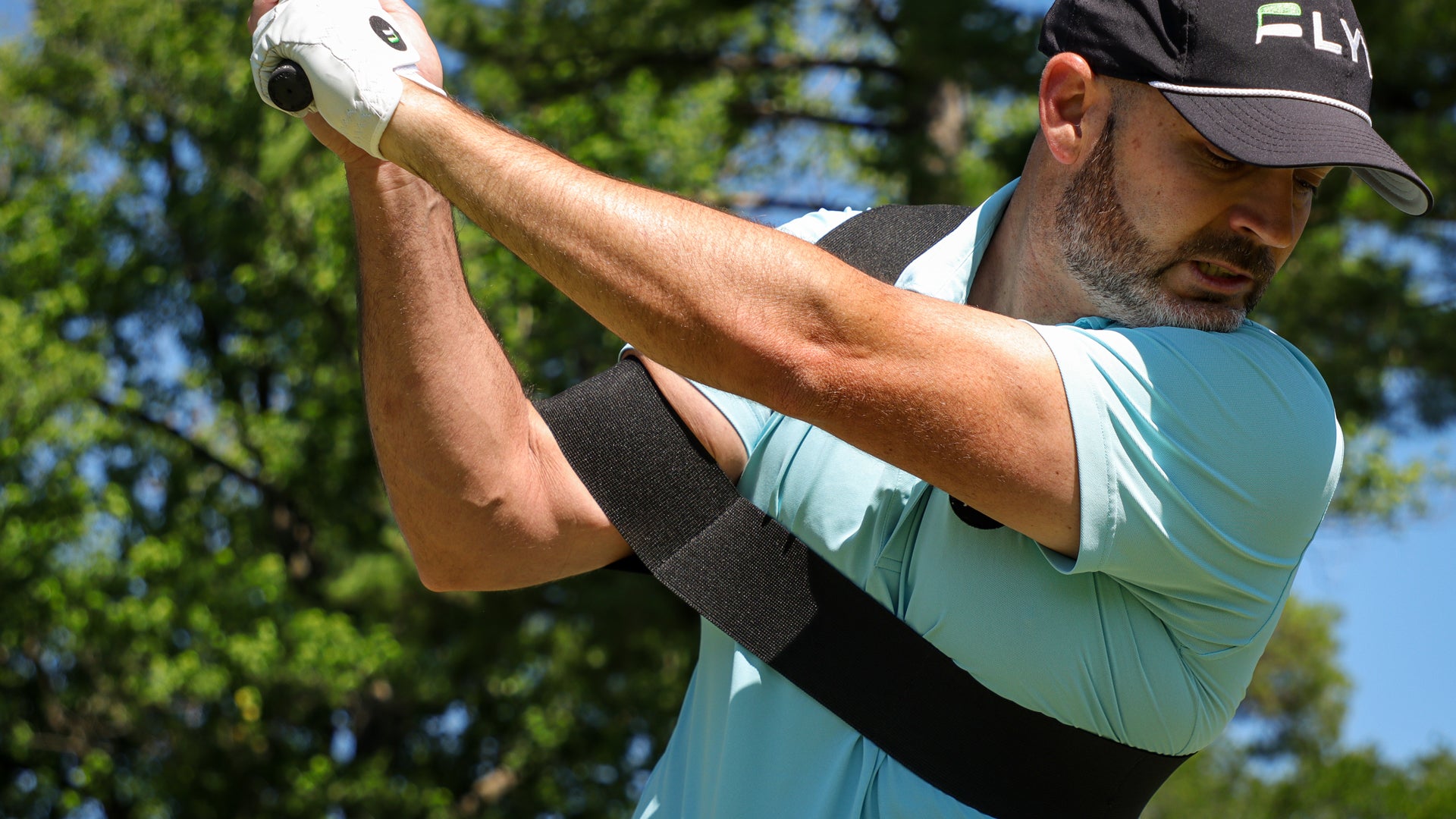 The FLYT Plane Strap is designed to help golfers who struggle with a 'flying elbow' or 'chicken wing' in the trail arm at the top of the backswing. The simple, unique design of the Plane Strap uses elastic resistance around the trail bicep and across the chest to keep the elbow tight to the body at the top of the backswing. This allows the golfer to get into a strong position or 'the slot' at the top of their back swing, making for an easy transition of power to start the downswing.